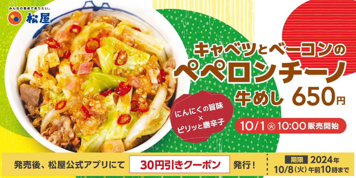 松屋が2024年10月1日から新メニュー「キャベツとベーコンのペペロンチーノ牛めし」の販売を開始しました。定番の牛めしにイタリアンテイストを加えた斬新な一品です。この記事では、新メニューの魅力や特徴、お得な情報までを詳しくご紹介します。